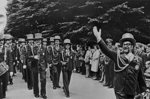 Pūtēju orģestris "Rīga" un diriģents Gunārs Ordelovskis (priekšplānā no labās) XV Vispārējo latviešu Dziesmu un Deju svētku gājienā