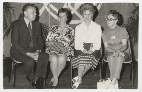 Annotation: Austrālijas Latviešu 24. Kultūras dienas. Rakstnieku pēcpusdienas dalībnieki. No kr.: Inārs Brēdrihs, Daina Šķēle, Janīna Babre (ASV), Elga Leja. Pērta, 1974.g. 24.decembris. Foto: nezināms. Otrā pusē zīmogs "ABC Photographers...". |