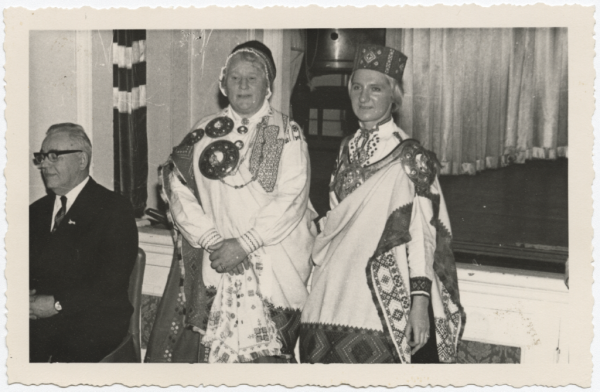 Annotation: Saktu meistars Rūdolfs Priede, (dz.1906.g. Vandzenē, Laidzē Talsu apr.) Bradfordas Daugavas Vanagu namā 1965. gadā. No kr.: Rūdolfs Priede, Vera Rulliņa, TDK "Sakta" vadītāja, Ilga Mieriņa, TDK "Kamoliņš" vadītāja ar Rūdolfa Priedes darinātajām saktām. Otrā pusē spiedoga nospiedums ar tekstu: "A.E. BALODIS Photographer, 12 Spennithorne Drive West Park, Leeds, 16 Tel.673607". |