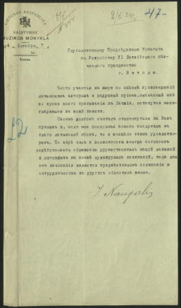 Sarakste ar 6. Vispārējo latviešu dziesmu svētku Rīcības komiteju par piedalīšanos žūrijas komisijā Naujalis, Juozas, 1869-1934