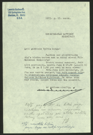 Sarakste ar I. Eiropas Dziesmu svētku Hamburgā rīcības komiteju, izdevuma „Latvija" galveno redaktoru O. Kalēju, LNP Lielbritānijā priekšsēdētāju A. Abakuku organizatoriskos jautājumos