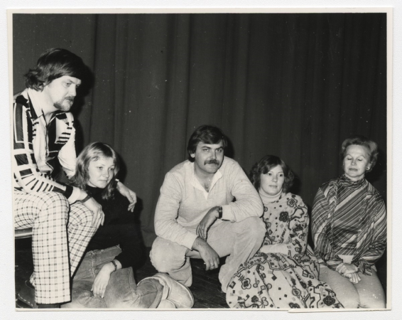 Skats no izrādes. Rihards Rīdznieks. "Spoguļa sienas". Lomās: no kr. Jānis Lindbergs, Māra Janmeija, Ansis Nīts, Gita Karvele, Ilga Puide