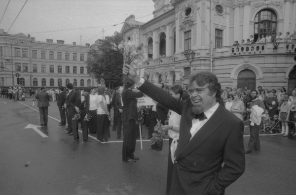 Spānijas pilsētas Laspalmasas kamerkora dalībnieki sveic XIX Vispārējo latviešu Dziesmu un Deju svētku gājiena dalībniekus pie Latvijas Nacionālā teātra Prēdelis, Imants, 1950-2018