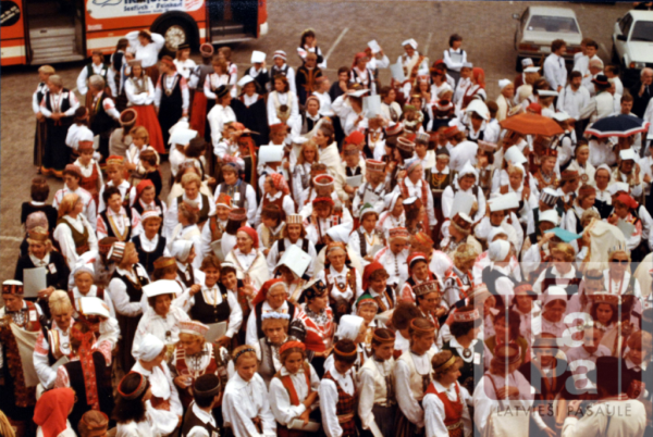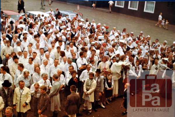 Annotation: Stāšanās pirms apvienoto koru dižuzveduma "No Dikļiem līdz Minsterei" Pasaules brīvo latviešu dziesmu dienās Minsterē, Vācijā, 1984. gadā. |