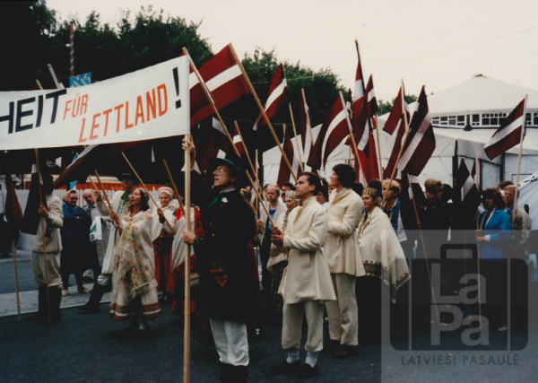 Annotation: Stājoties gājienam Berlīnē nacionālpolitiskās manifestācijas laikā, kas tika rīkota Berlīnē pēc Pasaules brīvo latviešu dziesmu dienām un kultūras svētkiem Minsterē. Speciālvilciens transportēja dziesmu svētku dalībniekus uz Berlīni. |