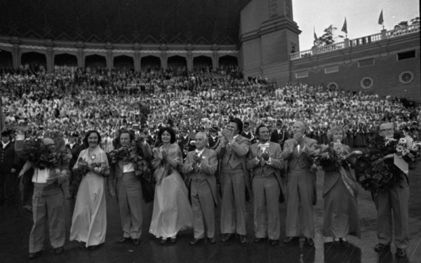 Svētku dalībnieki un virsdiriģenti pēc XVII Vispārējo latviešu Dziesmu svētku noslēguma koncerta Mežaparka Lielajā estrādē Pāže, Uldis, 1950-