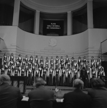 Tautas koris "Ausma" uzstājas koru konkursā "Koru kari" Pētera Stučkas Latvijas Valsts Universitātes Lielajā aulā XVII Vispārējo latviešu Dziesmu svētku laikā Janaitis, Gunārs, 1934-2022