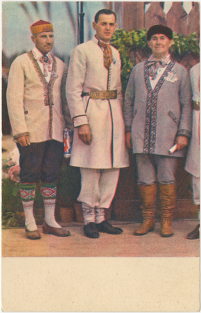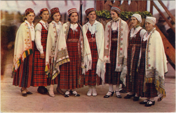 Annotation: Katrai atklātnei reversā pierakstīts fotogrāfijā redzamo tautastērpu etnogrāfiskais novads: 1) Kurzeme, 2) Pērkone, 3) Rucava, 4) Talsi, 5) Latgale, 6) Nīca, 7) Valmiera, 8) Lielvārde, 9) Cēsis, 10) Krustpils. |