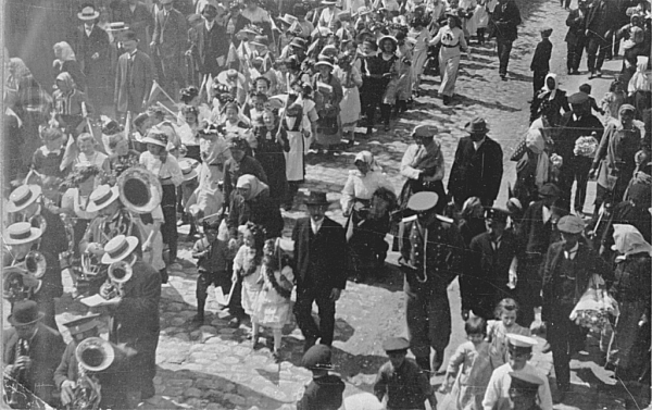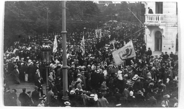 Annotation: V Vispārējo latviešu Dziesmu svētku gājiena dalībnieki un skatītāji Rīgas ielās. |