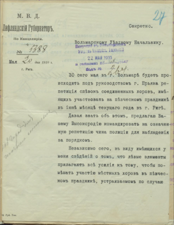 Valmieras apriņķa priekšnieka vecākā palīga slepenā sarakste