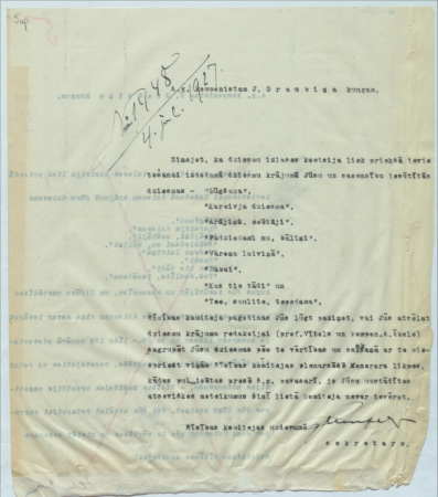 Vēstule komponistam Jēkabam Graubiņam no Rīcības komitejas