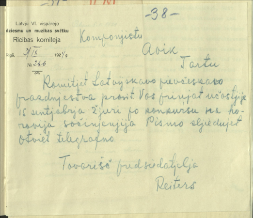Vēstule Juhanam Āvikam Reiters, Teodors, 1884-1956 Annotation: 6. Vispārējo latviešu dziesmu svētku Rīcības komitejas uzaicinājums Juhanam Āvikam piedalīties žūrijas komisijā. |