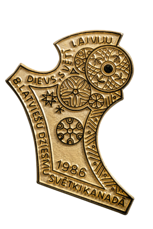 Annotation: Neregulāras formas zelta krāsas piespraude, rotājumā tautisks ornaments un saktas, apkārt uzraksts: "Dievs svetī Latviju." un "8.latviesu dziesmu svētki Kanadā. 1986". Aizmugurē saspraude piestiprināšanai. |