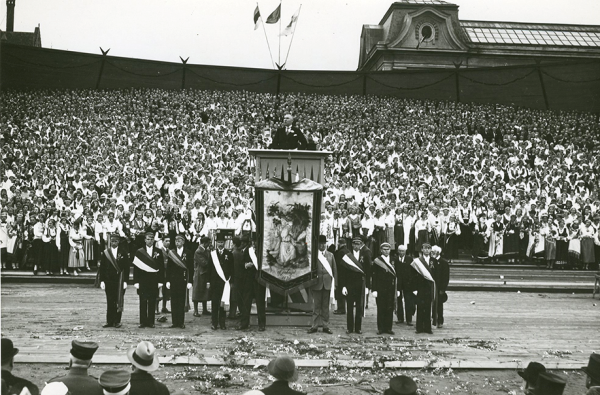 VIII Vispārējie latviešu Dziesmu svētki Johansons, Roberts, 1877-1959 Annotation: I Dziesmu svētku 60 gadu atceres Dziesmu svētki / VIII Vispārējie latviešu Dziesmu svētki. Dalībnieki ar Vispārējo dziesmu svētku karogu "Līgo". Rīga, 1933. gada 17. - 19.jūnijs. |