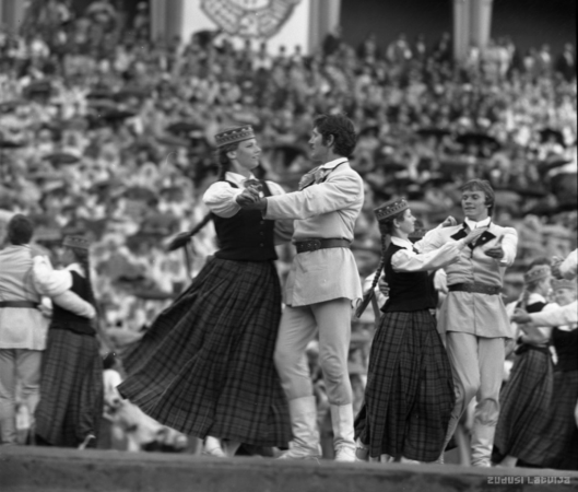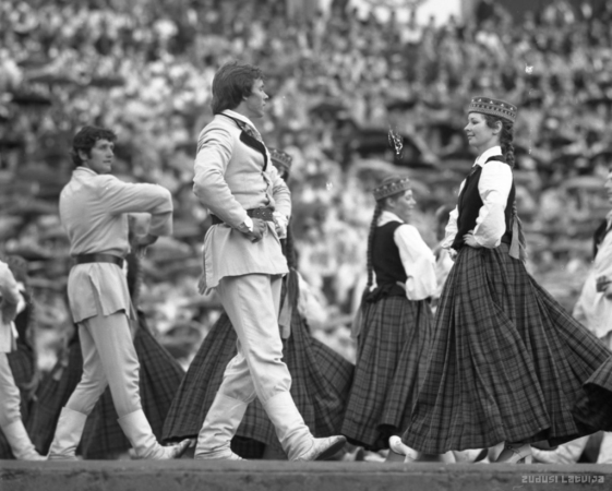 Vispārējie latviešu Dziesmu un Deju svētki 1980. gadā Salcēvičs, Romvalds, 1949- Annotation: 1980.gada jūlijā Rīgā notika astoņpadsmitie Dziesmu svētki un astotie deju svētki pulcējot Mežparka Lielajā estrādē 17425 dziedātājus , stadionā " Daugava '' ap 5000 dejotājus , kā arī aptuveni 2000 pūtēju orķestra muzikantus. Attēlā : Uz Mežparka estrādes tautas deju kolektīvu priekšnesumi |