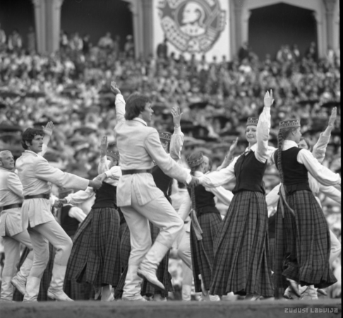 Vispārējie latviešu Dziesmu un Deju svētki 1980. gadā Salcēvičs, Romvalds, 1949- Annotation: 1980.gada jūlijā Rīgā notika astoņpadsmitie Dziesmu svētki un astotie deju svētki pulcējot Mežparka Lielajā estrādē 17425 dziedātājus, stadionā "Daugava'' ap 5000 dejotājus, kā arī aptuveni 2000 pūtēju orķestra muzikantus. Attēlā : Uz Mežparka estrādes tautas deju kolektīvu priekšnesumi |