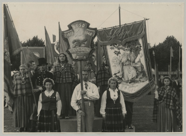 Annotation: Padomju Latvijas I Dziesmu svētki / X Vispārējie latviešu dziesmu svētki. Priekšplānā dalībnieki ar svētku emblēmu un Vispārējo dziesmu svētku karogu "Līgo", tālākie ar citiem karogiem un transparentiem. Rīga, 1948.gada 19. - 22.jūlijs. Foto: LTA. |