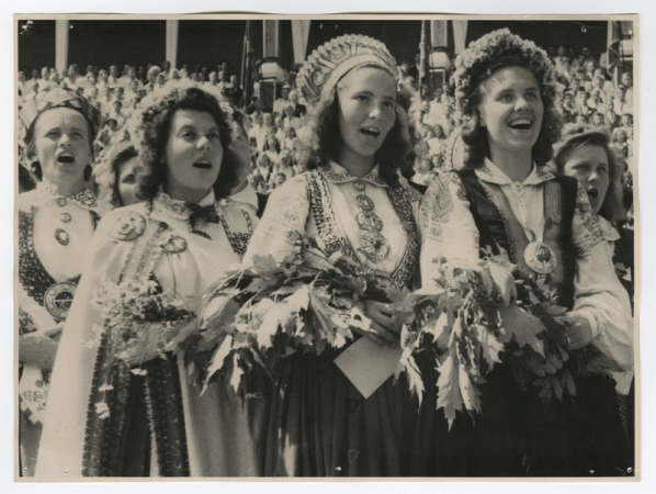 Annotation: Padomju Latvijas I Dziesmu svētki / X Vispārējie latviešu dziesmu svētki. Esplanādē. Dziedātājas kopkorī (tuvplānā, centrā Krišjāņa Barona mazmazmeita Ilze Ērgle). Rīga, 1948.gada 20. - 21.jūlijs. Foto: LTA. |
