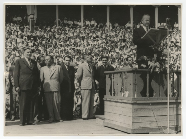 Annotation: Padomju Latvijas I Dziesmu svētki / X Vispārējie latviešu dziesmu svētki. Mītiņš pirms koncerta Esplanādē. Runātāja tribīnē Jānis Ostrovs (Ministru Padomes priekšsēdētāja vietnieks, Dziesmu svētku republikāniskās komitejas pr-js); partijas un valdības pārstāvji pie tribīnes. No kr.: 4.Vilis Lācis (Ministru padomes pr-js), 6.Arvīds Pelše, aizmugurē [? Jānis Kalnbērziņš]. Fonā kopkoris. Rīga, 1948.gada 21.jūlijs. Foto: LTA. |