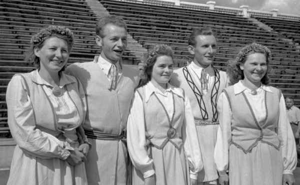 XII Vispārējo latviešu Dziesmu svētku dalībnieki no Rēzeknes rajona Otomāra Oškalna vārdā nosauktā kolhoza Mežaparka Lielajā estrādē Gedzjuns, Dominiks, 1918-1998 Annotation: No kreisās: 1. cūkkope A. Tuča, 2. Tautas nama vadītājs P. Romanovskis, 3. laukkope Jurova, 4. Birzgales skolas skolotājs Rupainis, 5. slaucēja B.Jurča. |