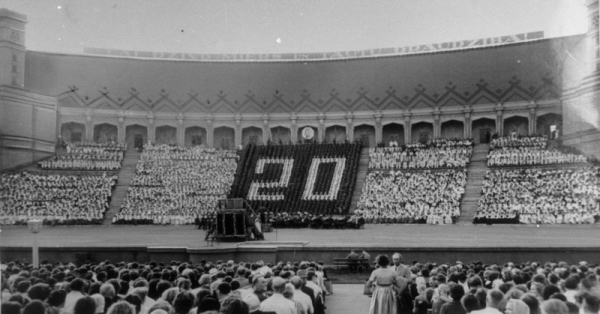 XIII Vispārējo latviešu Dziesmu svētku dalībnieki un skatītāji Mežaparka Lielajā estrādē