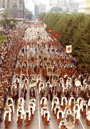 XIX Dziesmu un deju svētku gājiens Balodis, Leons, 1940- Annotation: XIX Dziesmu un deju svētku, kas veltīti 40. gadadienai kopš padomju tautas uzvaras Lielajā Tēvijas karā un 45. gadskārtai kopš padomju varas atjaunošanas Latvijā, gājiens Ļeņina ielā (tagad Brīvības bulvāris). |