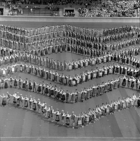 XIX Vispārējie latviešu dziesmu svētki Krauze, Gunārs, 1948- Annotation: Filma. Padomju Latvijas Dziesmu un deju svētki, veltīti 40. gadadienai kopš padomju tautas uzvaras Lielajā Tēvijas karā un 45. gadskārtai kopš padomju varas atjaunošanas Latvijā / XIX Vispārējie latviešu dziesmu svētki. Deju svētki "Daugavas" stadionā. Panorāmas foto. Rīga, 1985. gada 19. jūlijs. Foto: Gunārs Krauze. |