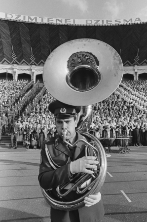 XIX Vispārējie latviešu dziesmu un deju svētki. Mežaparks. Svētku dalībnieks ar pūšaminstrumentu Janaitis, Gunārs, 1934-2022