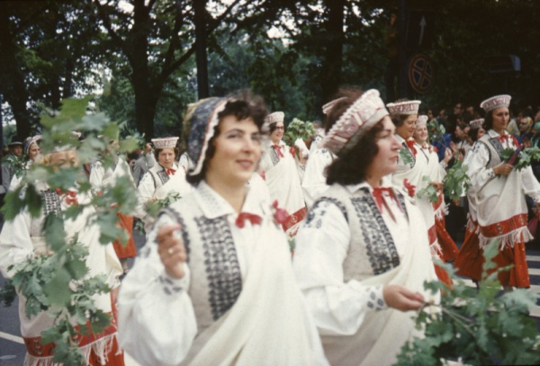 XVII Vispārējo latviešu dziesmu un deju svētku gājiens. Dalībnieces Nīcas tautas tērpā Kumsārs, Arvīds, 1935 -