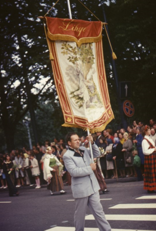 XVII Vispārējo latviešu dziesmu un deju svētku gājiens. "Lihgo" karogs Kumsārs, Arvīds, 1935 -