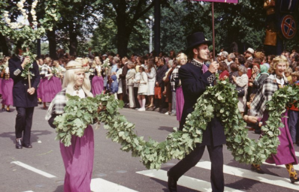 XVII Vispārējo latviešu dziesmu un deju svētku gājiens. Dalībnieki Alsungas tautas tērpā Kumsārs, Arvīds, 1935 -