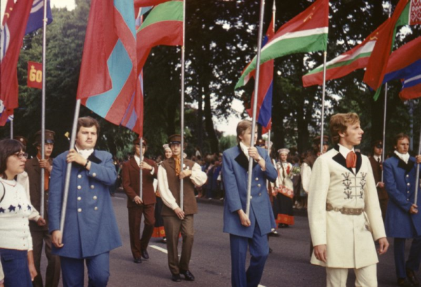 XVII Vispārējo latviešu dziesmu un deju svētku gājiens. Sadraudzīgo republiku karogu nesēji Kumsārs, Arvīds, 1935 -