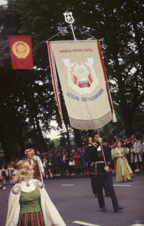 XVII Vispārējo latviešu dziesmu un deju svētku gājiens. Dziesmu svētku simtgades karogs Kumsārs, Arvīds, 1935 -
