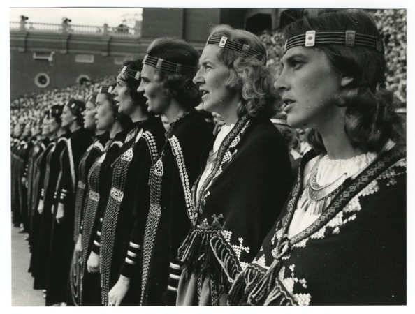 Annotation: Padomju Latvijas Dziesmu un deju svētki (IX), veltīti 40.gadadienai kopš padomju varas atjaunošanas Latvijā / XVIII Vispārējie latviešu dziesmu svētki. Rīga, 1980.gada 12. - 13.jūlijs. Jaukto koru "Daile" un "Juventus" dziedātājas estrādē. Foto: nezināms. |