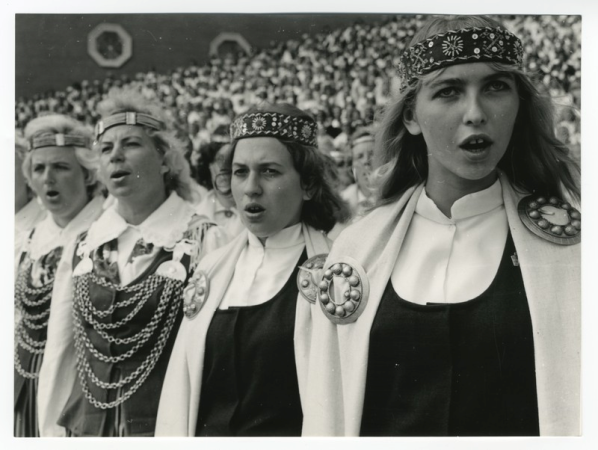 Annotation: Padomju Latvijas Dziesmu un deju svētki (IX), veltīti 40.gadadienai kopš padomju varas atjaunošanas Latvijā / XVIII Vispārējie latviešu dziesmu svētki. Kopkora dziedātājas (tuvplānā) Mežaparka Lielajā estrādē. Rīga, 1980.gada 12. - 13.jūlijs. Foto: nezināms. |
