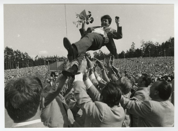 Annotation: Padomju Latvijas Dziesmu un deju svētki (IX), veltīti 40.gadadienai kopš padomju varas atjaunošanas Latvijā / XVIII Vispārējie latviešu dziesmu svētki. Mežaparka Lielajā estrādē. Koristi sumina diriģentu Jāni Grigali. Rīga, 1980.gada 12. - 13.jūlijs. Foto: nezināms. |