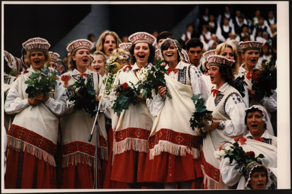 Annotation: XX Vispārējie Latviešu dziesmu un deju svētki. Koncerta "Tautasdziesma" dalībnieki tuvplānā. Rīga, Mežaparka Lielā estrāde. 1990.gada 7.jūlijs. Foto: nezināms. Krāsu foto. |