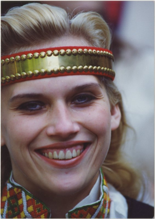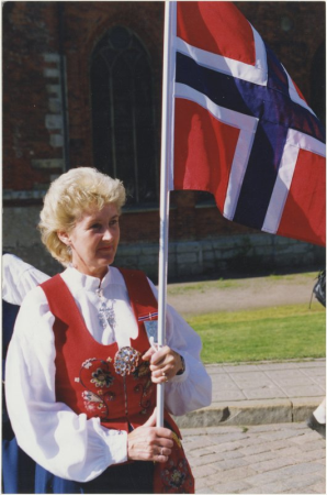 XX Vispārējie latviešu dziesmu un X deju svētki. Svētku dalībniece Balodis, Leons, 1940- Annotation: Karogs: Norvēģija |