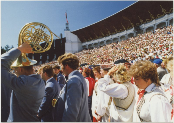 XX Vispārējie latviešu dziesmu un X deju svētki. Svētku dalībnieki Mežaparka estrādē Balodis, Leons, 1940- Annotation: Mūzikas instruments: mežrags |