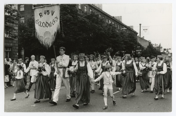 Annotation: XX Vispārējo latviešu dziesmu svētku un X Deju svētku gājiens. Rīgas 45. vidusskolas jauktais koris "Gundega" (diriģente Ilga Millere), tālāk koris "Fortius". Rīga, Pērnavas iela. 1990.gada 7.jūlijs. Foto: nezināms. |