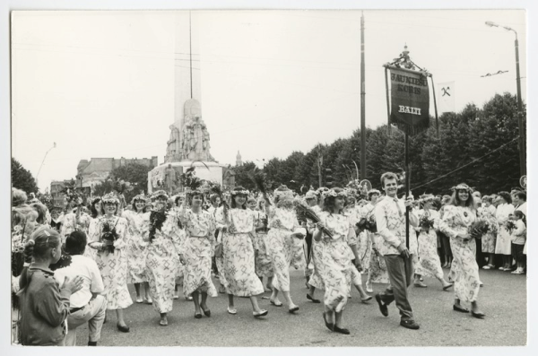 Annotation: XX Vispārējo Latviešu Dziesmu svētku un X Deju svētku gājiens. Saldus jauniešu koris "Balti" (diriģents Normunds Dreģis) pie Brīvības pieminekļa. Rīga, 1990.gada 7.jūlijs. Foto: nezināms. |