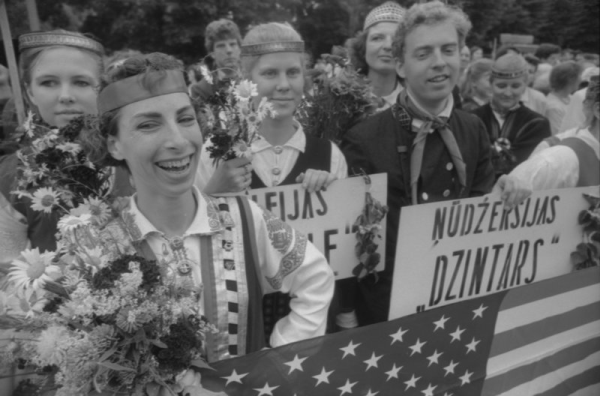 Ārzemju diriģenti Roberts Zuika no ASV un Lilija Zobens no Anglijas XXII Vispārējo latviešu Dziesmu un XII Deju svētku gājienā Grigalis, Guntars