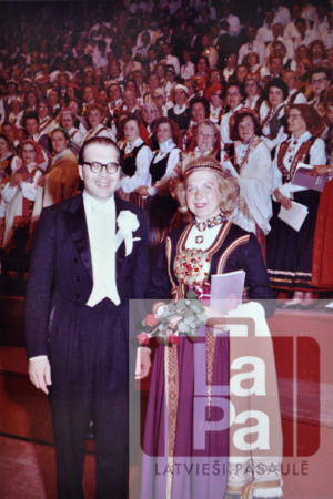 Annotation: Virsdiriģents Arvīds Purvs un soliste Maiga Dežardēna koru kopkoncertā Maple Leaf Gardens hallē 4. latviešu Dziesmu svētkos Kanādā 1965. gada 29. maijā. |