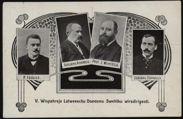 Atklātnes ar dziesmusvētku virdiriģentu, valdes un Prāgas vīru kora attēliem