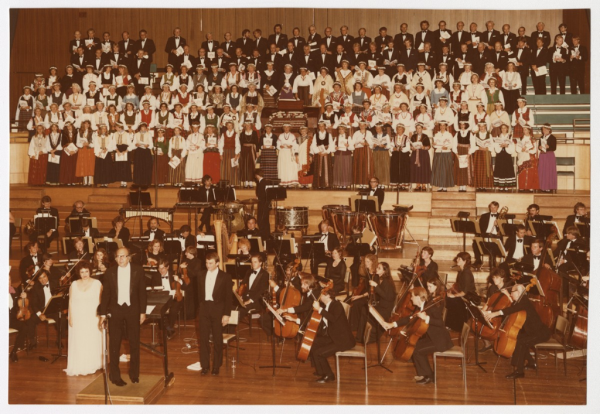 Annotation: Austrālijas Latviešu 33. Kultūras dienas. Atklāšanas koncerts. Melburnas Dallas Bruksa zāle. Uz skatuves kopkoris ar Austrālijas filharmonisko orķestri pēc Alfr.Kalniņa operas "Baņuta" koncertuzveduma. Solisti Stella Aksarle (soprāns), Jānis Vēgners (bass-baritons), blakus solistei diriģents Arvīds Purvs. 1983.g. 26.decembris. Foto: nezināms. |