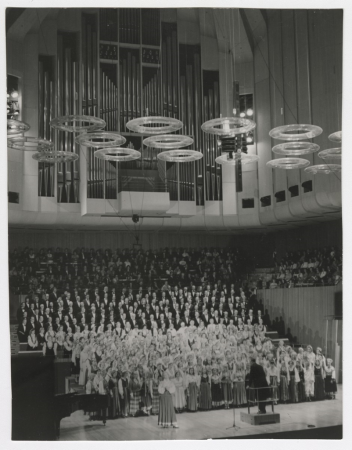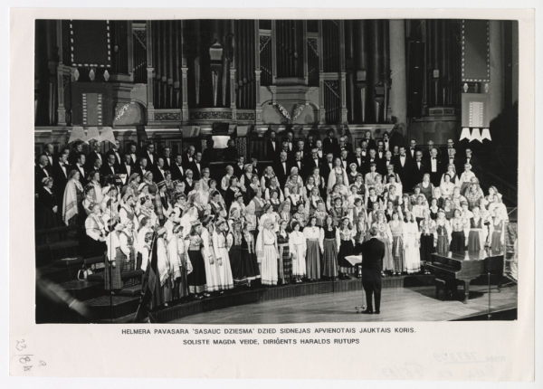 Annotation: Austrālijas Latviešu 23. Kultūras dienas. Atklāšanas koncerts Sidnejas Pilsētas namā. Sidnejas apvienotais jauktais koris, diriģents Haralds Rutups, soliste Magda Veide (centrā, baltā tautas tērpā). Koris izpilda Helmera Pavasara "Sasauc dziesma". 1973.g. 26.decembris. Foto: nezināms. |