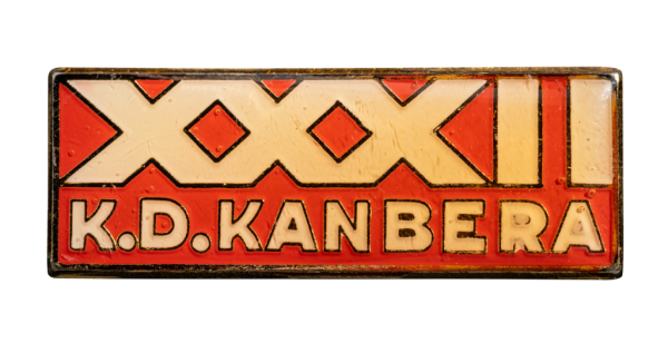 Annotation: Taisnstūra formas, emaljēta piespraude. Uz sarkanā fona bēšiem burtiem uzraksts “XXXII/ K.D.KANBERA”. Zelta krāsas iekantējums. Izdota 32.kultūras dienām Kanberā, Austrālijā 1982.gadā. Rv. piestiprināta metāla saspraude- t.s. taurenītis. Nozīmes pamatnē iespiests uzraksts “Perfection/Sydney”. |
