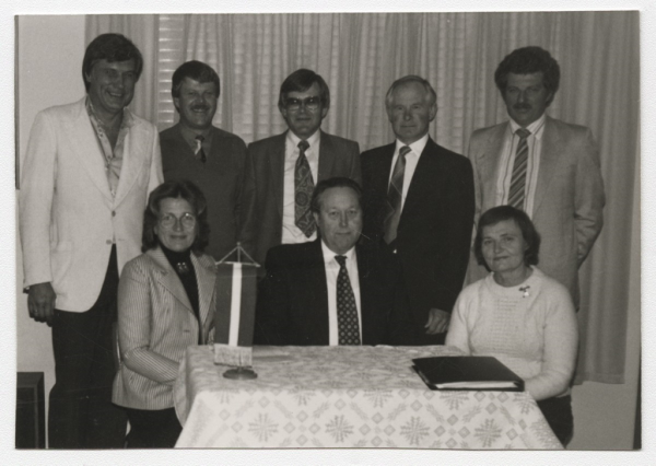 Annotation: Austrālijas Latviešu 32. Kultūras dienu Rīcības komiteja (valde). No kr. sēž: Biruta Ūdre, Žanis Mediķis (priekšsēdis), Skaidrīte Darius; stāv Tuvis Briedis, Andrejs Bobets, Andrejs Stīpnieks, Alberts Levics, Ojārs Bobets. Kanbera, 1982.g. 27. - 31. decembris. Foto: nezināms. |