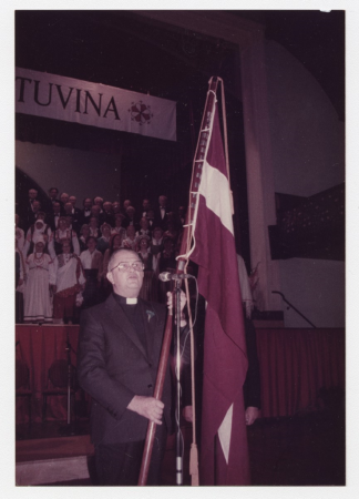 Annotation: Austrālijas Latviešu 34. Kultūras dienas. [35. KD priekšsēdis mācītājs Laimonis Mušinskis] ar saņemto Latvijas karogu. Lonsestona, Tasmānija, 1984.g. 30. decembris. Foto: nezināms. |