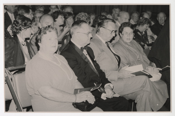 Annotation: Skatītāju zālē 1. rindā no kr. sēž KD priekšsēdis Laimonis Mušinskis ar kundzi, Rietumaustrālijas valdības ministrs Rons Deiviss (Davies) un KD sekretāre Tamāra Karabanova. Pērta, 1985.g. 26.decembris. Foto: nezināms. |